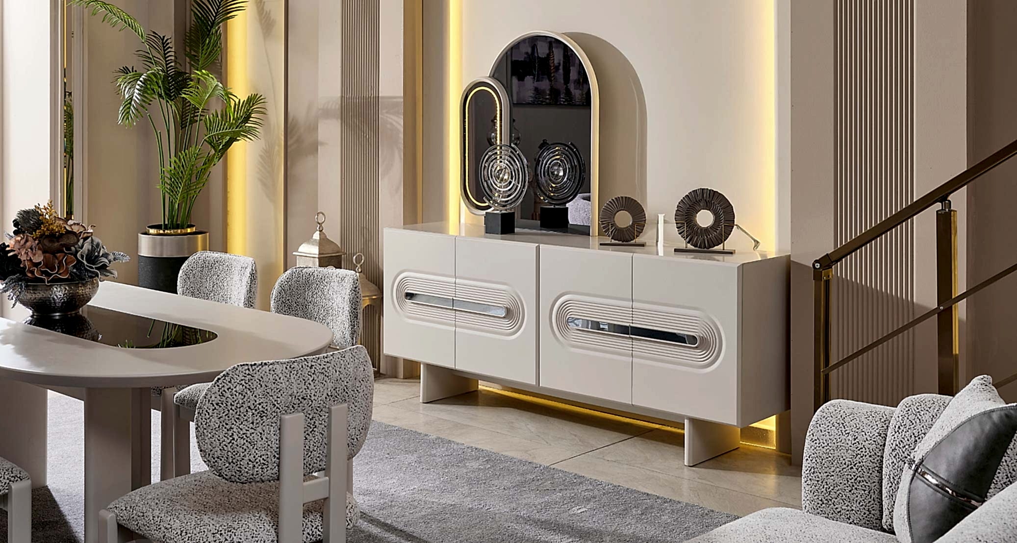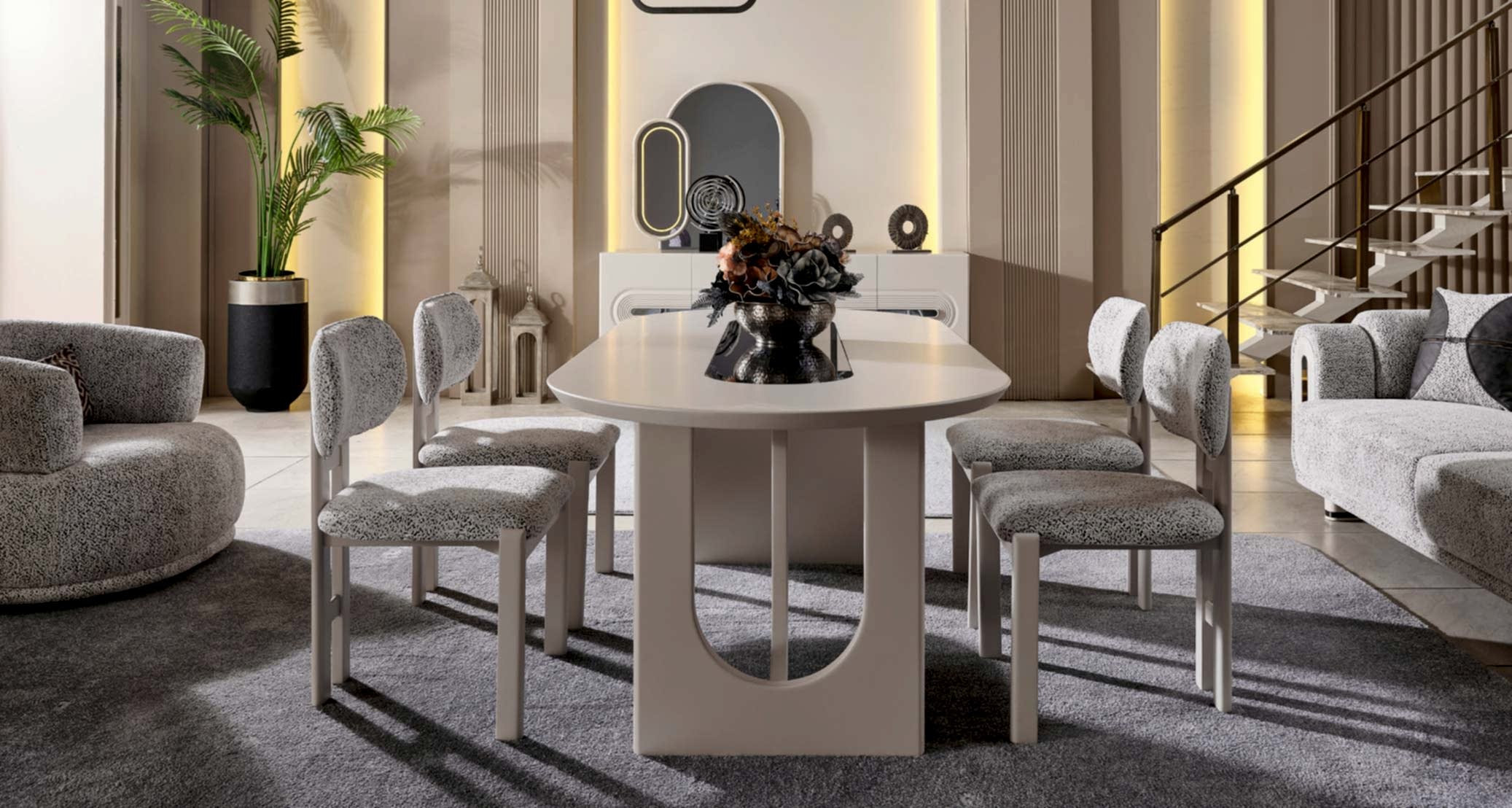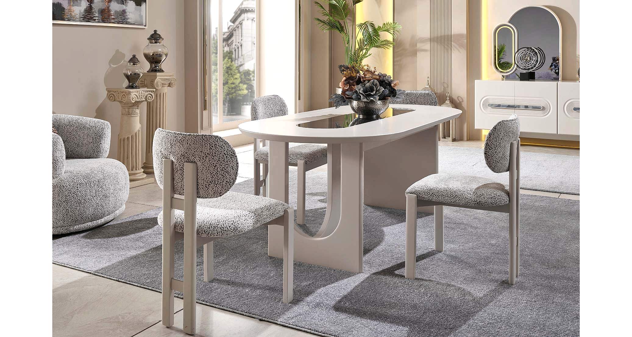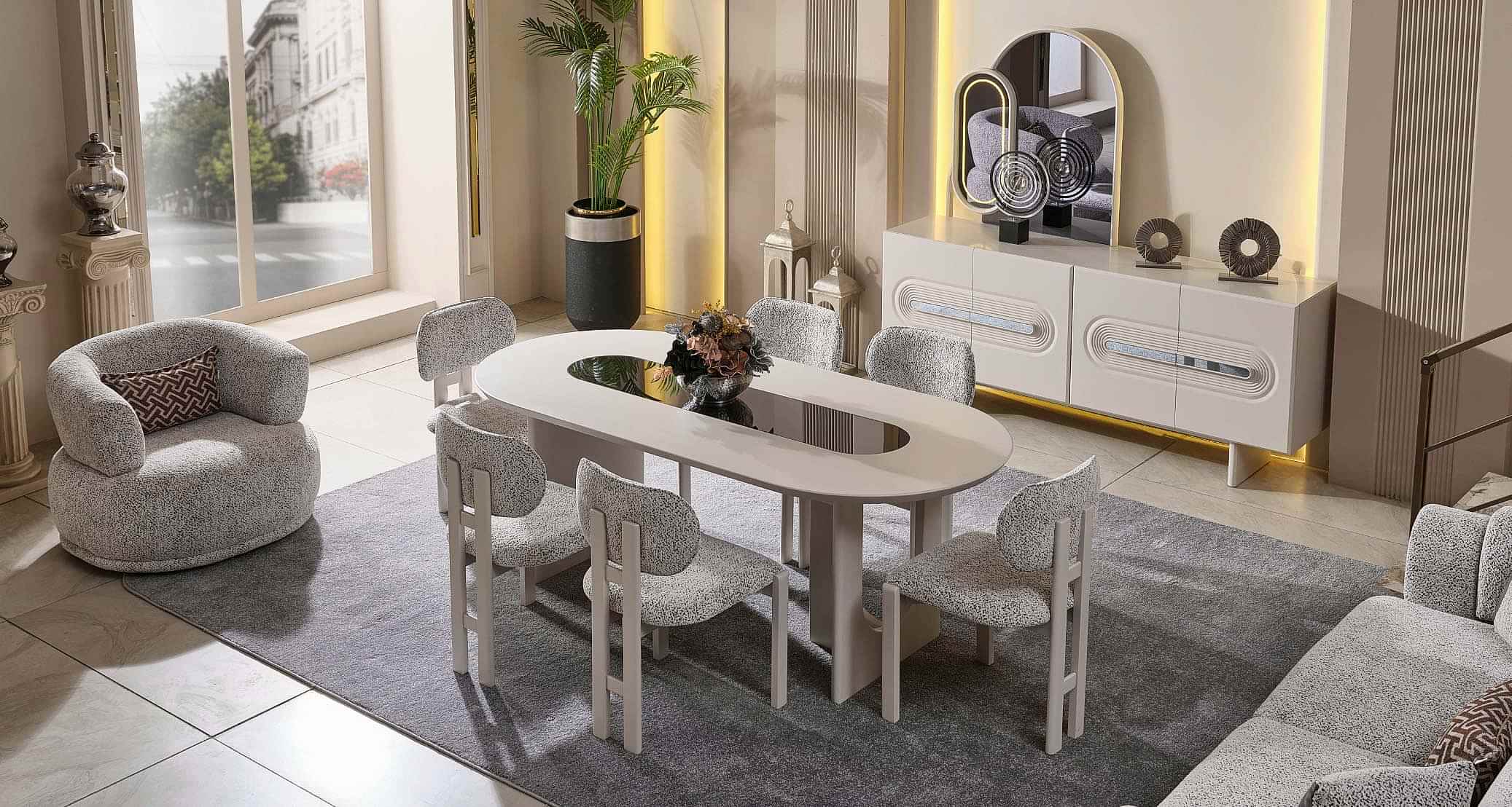 Parma Yemek Odası Takımı, zarif detayları ve fonksiyonel yapısıyla yemek alanlarınıza modern bir hava katar. Kaliteli malzemelerle üretilmiş olup, geniş masa yüzeyi ve konforlu sandalyeleriyle keyifli sofralar kurmanıza olanak tanır. Konsol ve vitrin gibi tamamlayıcı parçalarıyla depolama alanı sunarken, estetik görünümüyle de dikkat çeker. Parma Yemek Odası Takımı, hem günlük kullanım hem de özel davetler için ideal bir seçenektir. Şıklığı ve kullanışlılığı bir arada arayanlar için mükemmel bir tercihtir.